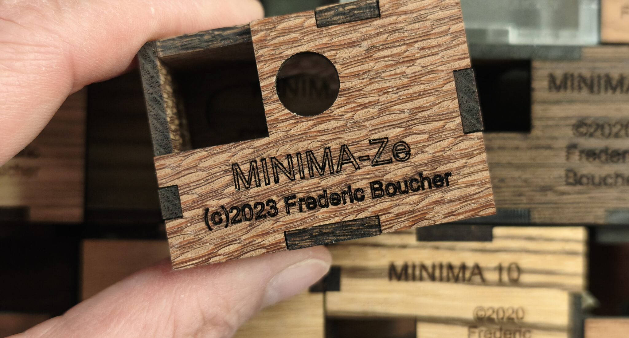 Nejprve probíhalo gravírování, během kterého jsme na jednotlivé díly nanášeli označení verzí (např. MINIMA 4, 7, 10), branding i autorské značení. Laser umožňuje dosáhnout velmi jemného detailu a vysoké čitelnosti i na malých plochách, což je u těchto kompaktních krabiček klíčové. Následně jsme přešli k řezání jednotlivých dílů, kde je zásadní přesnost a kvalita hrany – laser zajišťuje čisté řezy bez nutnosti dalšího opracování a umožňuje vytvářet i velmi jemné konstrukční detaily, jako jsou přesné spojové prvky. Kombinací obou procesů jsme dosáhli nejen funkční přesnosti, ale i vizuálně atraktivního výsledku napříč různými materiály, jako je masivní dřevo, překližka nebo transparentní plexi.